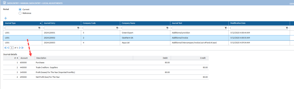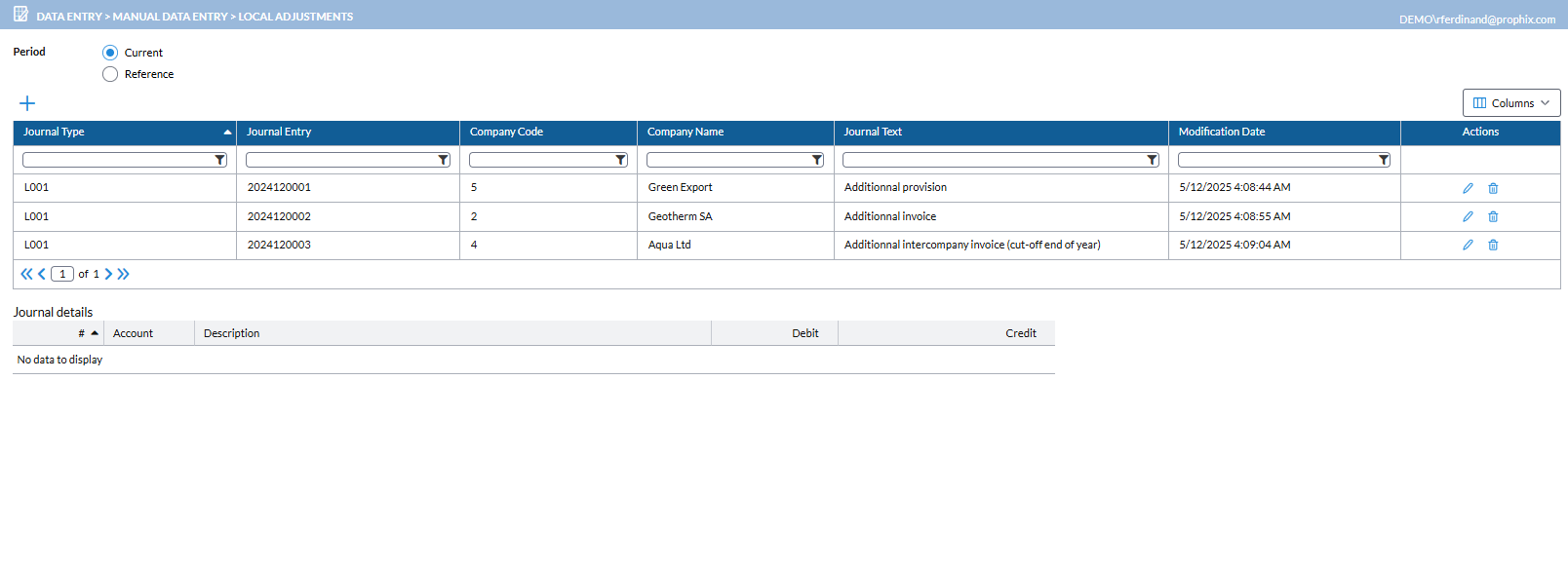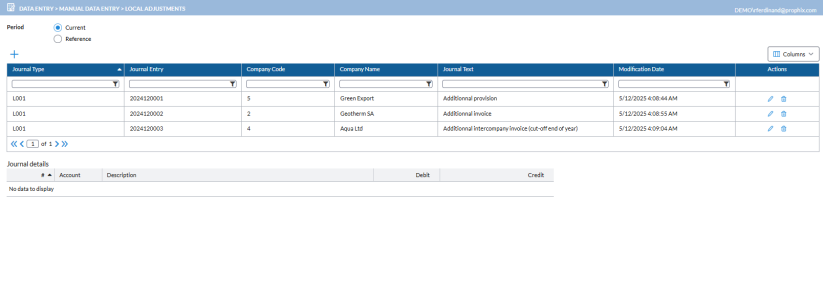 The top panel displays the list of local adjustments that are already available in the consolidation by: