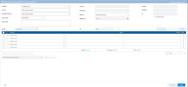 Repeat button - allows you to repeat the amount from the current line. For example, if you have a journal entry impacting for the same amount multiple accounts alternately as debit or credit, instead of filling in the account codes on each line, you can use this option to facilitate the input of adjustments having repetitive amounts and avoid input error. See Repeat an amount for details. -