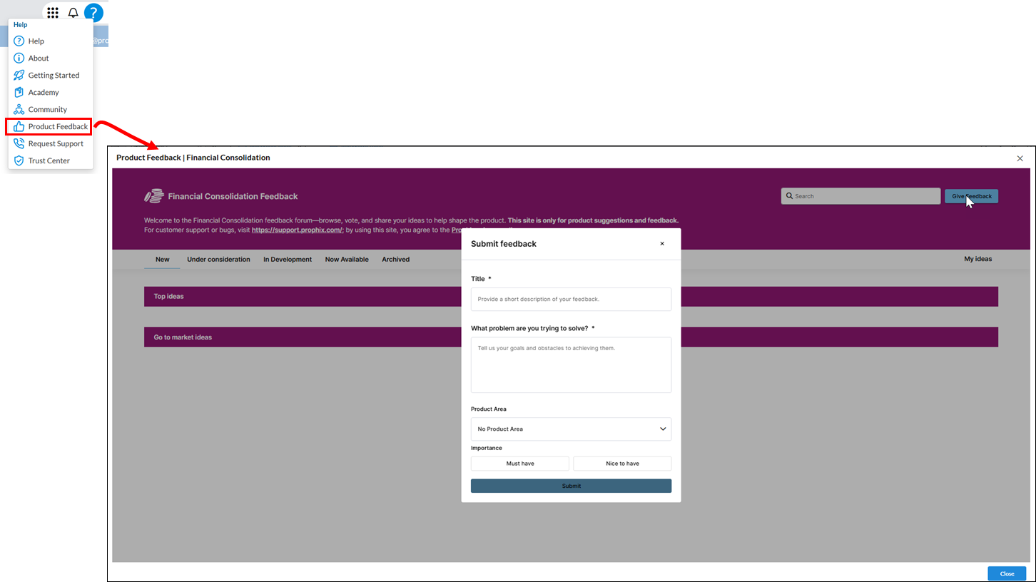 Clients can now submit ideas and feedback without leaving the Prophix platform, no separate login required. Access is instant, with no wait times or manual approvals.
