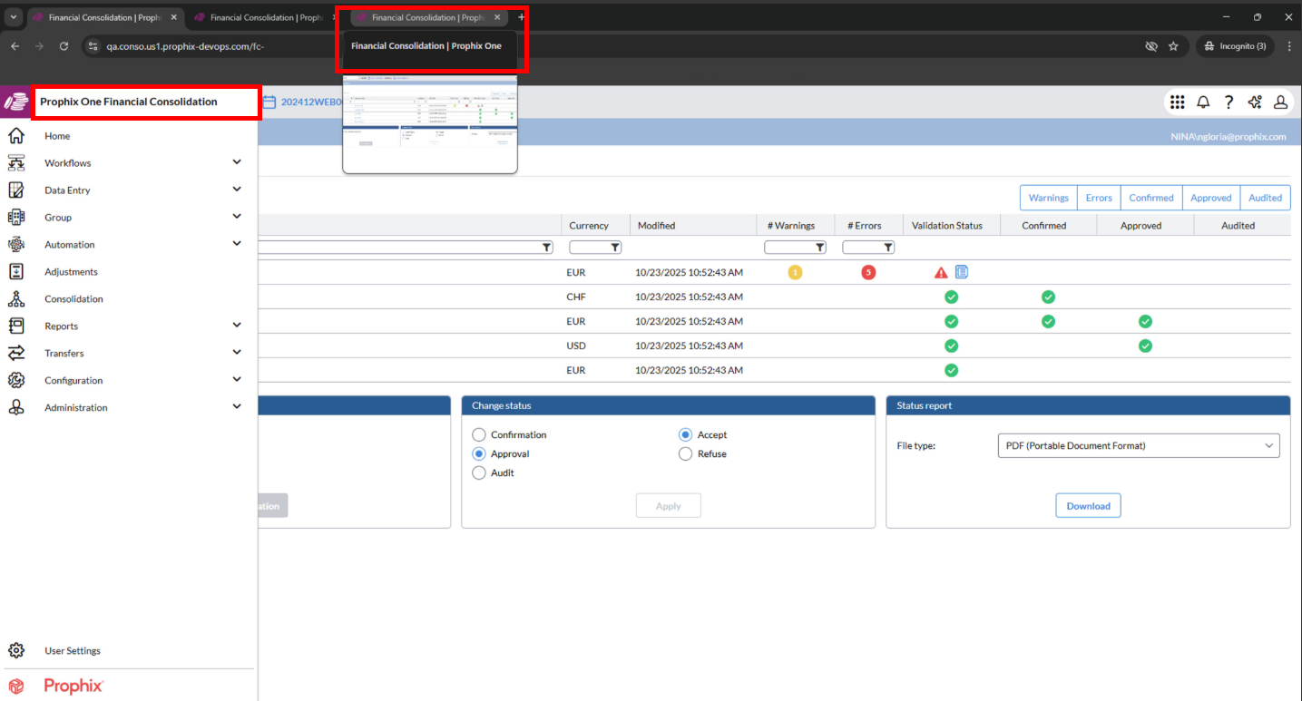 When accessing Financial Consolidation through the Prophix One portal, the browser tab now displays Financial Consolidation | Prophix One.